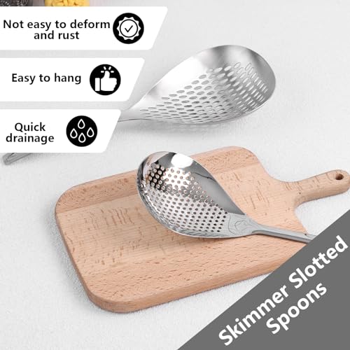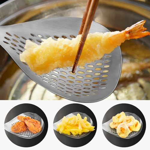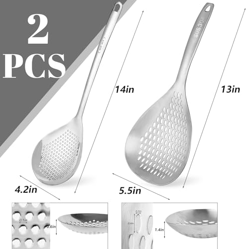Versatile Kitchen Tool – This stainless steel cooking skimmer is a versatile kitchen tool suitable for various cooking tasks. The spoons can be used to fry French fries, potato chips, fried chicken, and scoop up poached eggs, noodles, vegetables, pasta, and more.