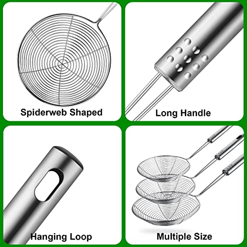 Multiple size: Set of 3 different strainers, diameter: 4. 3Inch, 4. 9Inch and 5. 7Inch(11cm, 12. 5cm and 14. 5cm), total length: 12Inch, 12. 6Inch and 13. 7 inch(30. 5cm, 32cm and 35cm). The long handle can protect your Hands from hot grease and oils when you cooking or frying.