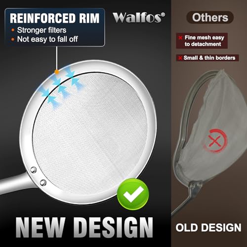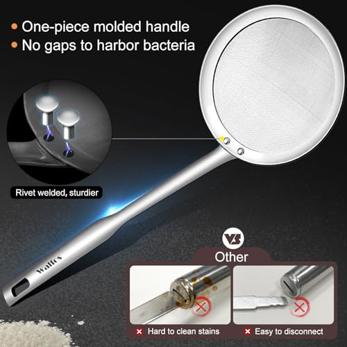 ★ EASY TO CLEAN AND STORE – Walfos skimmer spoon mesh easy cleaning after using, Just a little rinse with detergent, they also dishwasher safe! The end of the handle designed with a hanging hole allow for easy hanging and drying, less mess, making your life in the kitchen easier every day.