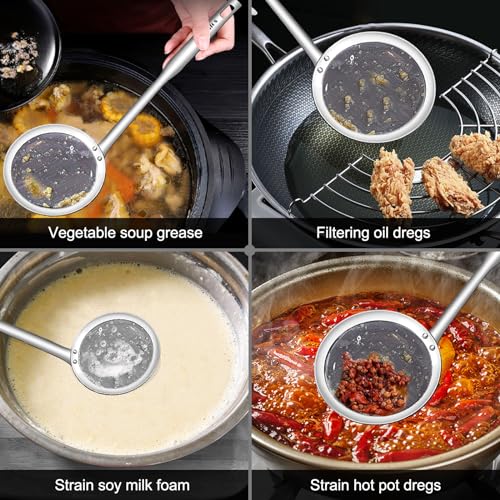 ★ NO MORE FOAM & SCUM- The fine mesh skimmer has a fine 304 stainless steel mesh, perfect to separate the floating fat, grease, foam or scum from soups. Lightweight skimmer spoon with Ergonomic handle is comfortable to hold, avoiding the hand joint get injured during long-term stirring using.