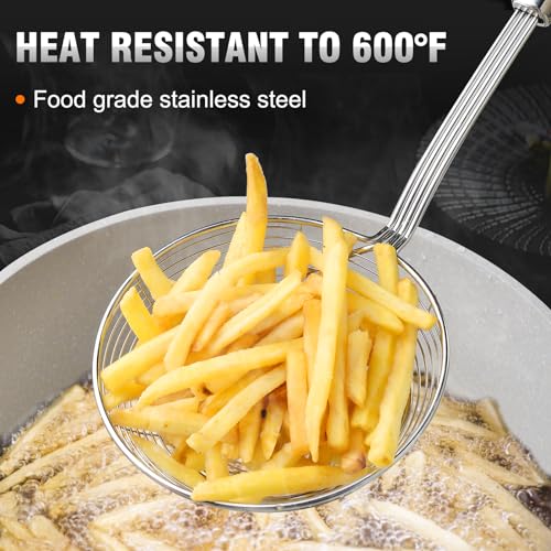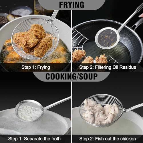 Walfos Spider Strainer, Set of 2-5.5 Inch Stainless Steel Fryer Scoop & 4 inch Fat Skimmer Spoon, Kitchen Spider Skimmer Strainer With Handle, For Cooking Deep Fryer, Pasta, Egg,Fat
