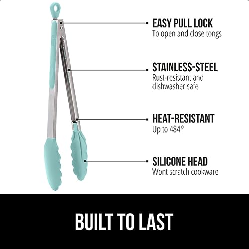 Gorilla Grip Stainless Steel Heat Resistant BBQ Kitchen Tongs Set of 2, Non Scratch Silicone Tip for Nonstick Cooking Pans, Strong Grip for Grabbing Hot Food, Air fryer, Pull Lock, 7 and 9 Inch, Mint